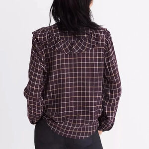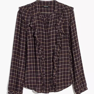 Dramatic ruffles and understated metallic accents give this plaid button-down shirt an extra festive touch. A wear-all-season-long top to wear with jeans, skirts, anything.