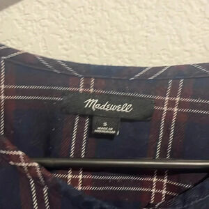 Gently worn Madewell Plaid Ruffle-Yoke Long Sleeve Blouse Navy Blue and Burgundy Small. Button up and long sleeve. 100% cotton. Clean and no signs of damage. Bust measures 19 inches across.