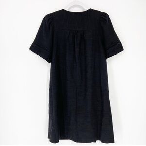 Short sweet peasant style mini dress with retro covered buttons, intricately pleated bib and peekaboo eyelet stitching.