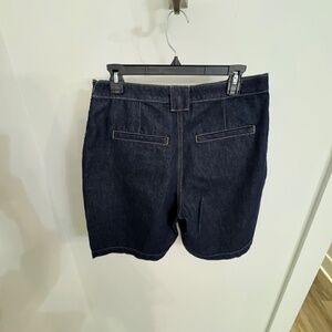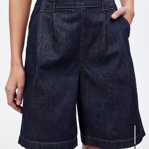 Trouser short from Madewell in Essex Wash. Relaxed yet tailored cut with a high rise, front pleats and long inseam. 12" rise, 9" inseam. 100% cotton. Selling at reduced rate bc of very small hole near zipper. Can not see hole when wearing. Never worn these, only tried on. Really cute on the right person. Size 28 (I sized down from my normal size of 29)