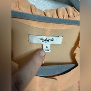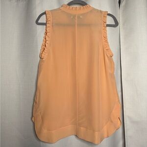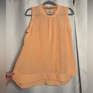 Madewell Pleated Ruffle Peach Sleeveless Blouse. Sleeveless peach blouse made of a lightweight, semi-sheer fabric (feels like silk, but no fabric tag). It features delicate vertical pintuck pleats down the front and ruffled trim along the armholes and neckline. The blouse has a layered hem and a short front placket with a small button closure, adding a touch of elegance to its flowy silhouette. Size Small.