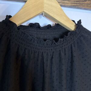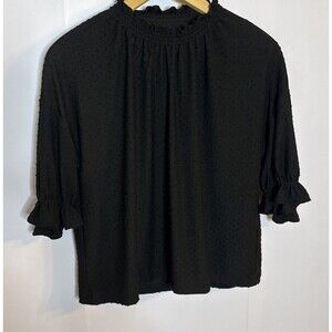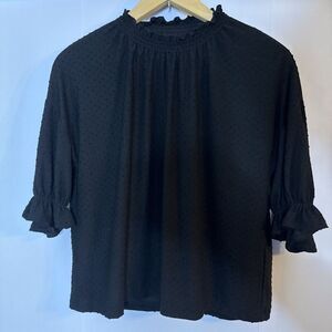 This Madewell blouse in size XS features a flattering mock neck and a stylish polka dot pattern. The top is designed with ruffle accents and puff sleeves, giving it a feminine and elegant look. The oversized, relaxed fit adds a touch of modernity to the classic design, suitable for various occasions from parties to business settings. Made of a comfortable knit fabric blend of polyester and viscose, this black blouse is easy to care for and offers stretch for added comfort. Perfect for those who appreciate designer style with a hint of old money sophistication.