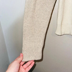 Madewell cream & tan colorblock Province cross-back pullover sweater. In excellent condition! Crew neckline. Long sleeves. Cross back style. Colorblock. Thick knit material. Cream color with tan sleeves & neckline. Size medium.
