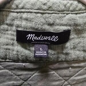 Keywords: Madewell, quilted pullover, half zip, mock neck, olive green, women's top, sweatshirt, casual wear, relaxed fit, textured, layering piece, large, comfortable, athleisure, contemporary