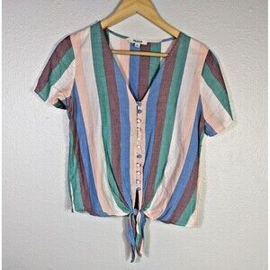 Add color to your wardrobe with this Madewell Rainbow tie-front blouse top. It features a V-neck, short sleeves, tie-front closure, and band collar.