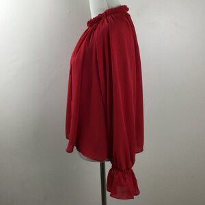 Semi sheer. boxy fit. Ties at neck. Elastic/flowy cuffs.