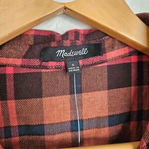 This Madewell shirt features a collar, cuffed long sleeves, and a notched collar. The red and black plaid design adds a classic touch to this button-down top.