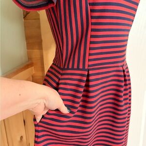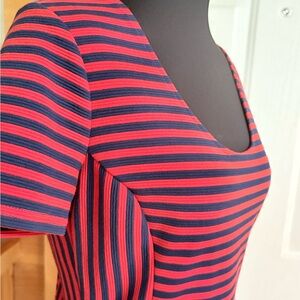 This Madewell dress features a striking red and blue color palette, perfect for casual or work settings. The short sleeves and scoop neckline complement the flattering A-line silhouette, making it a versatile addition to any wardrobe.