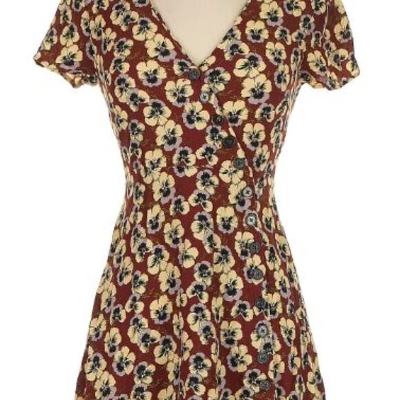 This Madewell dress features a stunning floral print in red and brown, ideal for both casual and cocktail settings. With its plunge neckline and flutter sleeves, it offers a chic and feminine silhouette. The midi length and fitted waist enhance its versatile appeal.