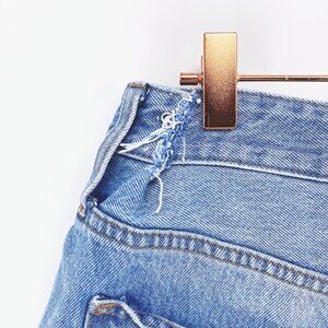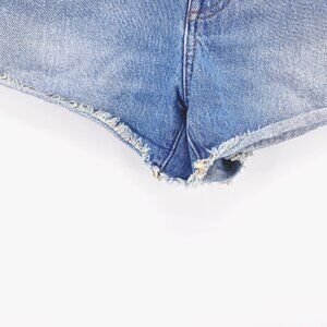 Medium wash high waisted distressed shorts with a raw hem. 100% cotton