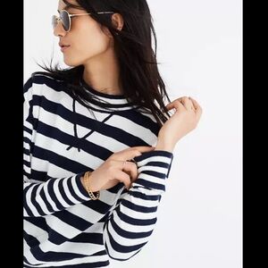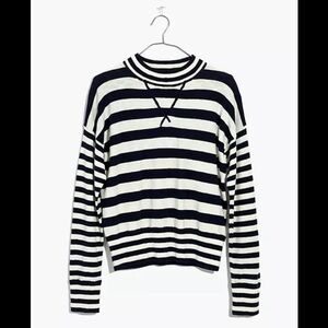 Slouchy and soft, this mockneck sweater has the vibe of a vintage sweatshirt (see: tall cuffs, banded waist, bold stripe mix). So easy with jeans.