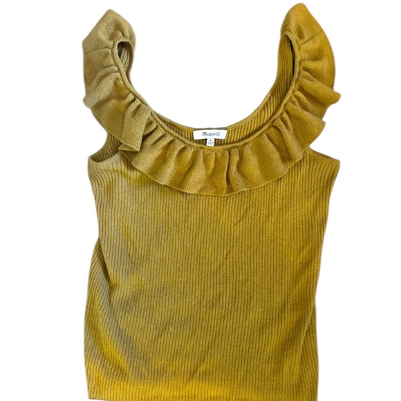 ✨ Effortlessly feminine! This Madewell ribbed knit top in a warm camel brown features a flattering off-shoulder neckline with ruffle trim.