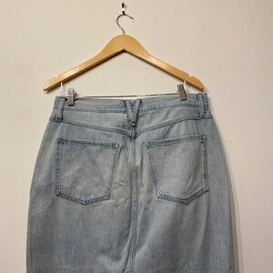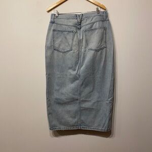 Made of 100 percent cotton denim with zero stretch, this lean A-line midi was inspired by a vintage skirt handcrafted from a pair of jeans. Just add a tank and sandals for an instant outfit (it has a slit in front for easy strolling). 100% cotton denim. Light wash. Retro style. Size 31.