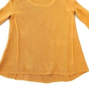 Madewell Riverside Mustard Textured Crewneck Sweater. Size XS. Crewneck line, textured knit, slight hi-lo hem, ribbing on neck, bottom hem & cuffs. 62% cotton, 20% viscose, 18% nylon. Chest 18”, length 24-25”, sleeve 28”. Measurement approximate. Sweater in good preowned condition.