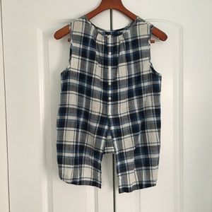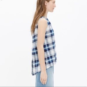 Gently worn- blue plaid tank. Buttons down the back- and splits open at the bottom. Light-weight. Shorter in front