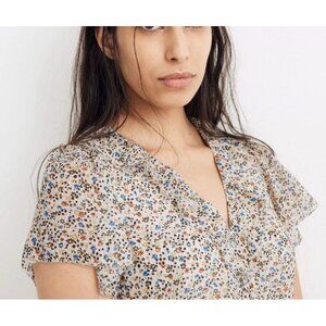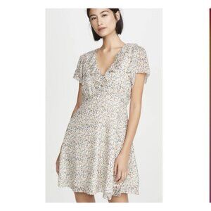 Madewell Ruffle Neck Mini Dress Cream Floral 100% Silk V Neck Short Sleeve Sz 4