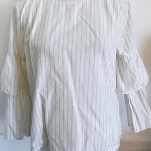 Beautiful 100% cotton white Madewell blouse with light gray striped. The ruffle sleeves add a bit of flare.
