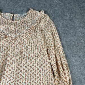 Step into a world of effortless style with the Madewell Ruffle-Yoke Prairie Top. Sized small, this piece is a celebration of lively orange hues paired with a charming floral pattern that blooms across its fabric. A round neckline and long puff sleeves add a touch of whimsy, making it an ideal choice for those casual outings, travel adventures, or a cocktail party. The blouse boasts a regular fit, ensuring comfort without compromising on style. With its easy pullover closure, machine-washable care, and a subtle ruffle accent that lends a hint of playfulness, this top is a versatile addition to your wardrobe. Embrace the changing seasons from summer's warmth to fall's brisk breezes with this blooming beauty.