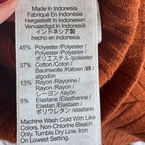 Stylish ribbed top with button-down front. Rich rust color. Gives a cool 70s vibe and is very comfortable, almost feels like soft knitwear.