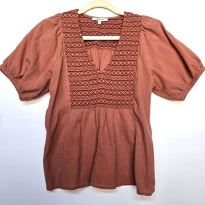 Elevate your style with this rust-colored embroidered top. Perfect for any occasion.
