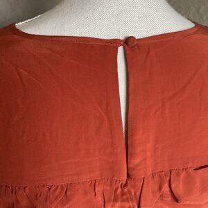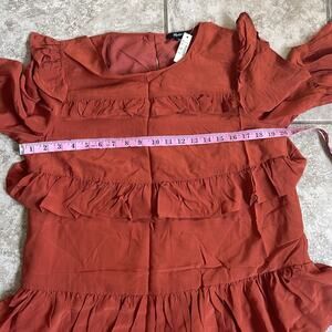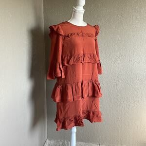 Chic rust dress with layered ruffles. Long sleeves. Perfect for any occasion.