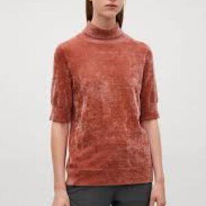 -Madewell rust orange velvet mock neck short sleeve shirt.