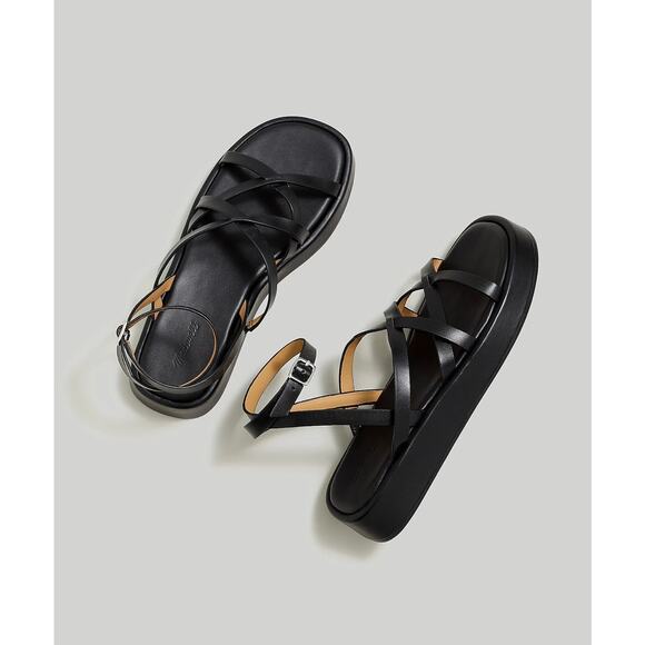 For sale a pair of like-new Sabina Flatform Sandal by Madewell. Color Black. Size Women 9M. I purchased these for a reunion weekend event and have not worn them since. Tip-top shape. Clean. No marks, scuffs or blemishes. Comfortable, stylish sandals. Purchased from the Madewell store in Chicago.