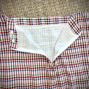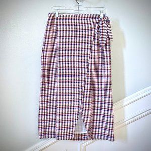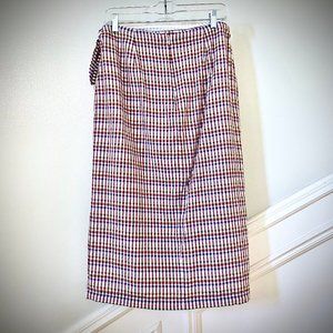 Like new! Flattering sarong-inspired wrap style skirt is perfect for throwing on for easy summer days. Lightweight cotton skirt is fully lined. Adjustable ties at waist. Colors are dark red, blue and green gingham puckered plaid. Flat measurements: Waist = 15.5", Hips = 20" approx, Length = 30". Machine wash.