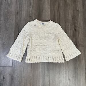 Madewell Scalloped-Trim Sweater Tee Women’s Size XS – Item NU548, Cream Colorway, Pullover Style, Crewneck Design, Cropped Length, Open-Knit Sweater Fabric, Sheer, 3/4 Sleeves, Scalloped Trim Detailing, Lightweight & Breathable, Relaxed Fit, Cotton Blend, Feminine and Casual-Chic, Perfect for Layering or Warm-Weather Wear.