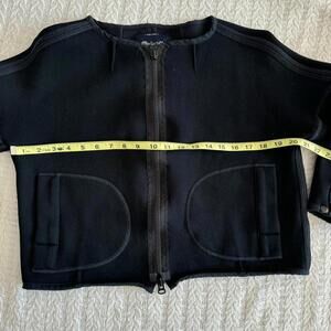 Elevate your wardrobe with this chic Madswell cropped jacket in classic black. Perfect for layering, this stylish piece features a front zip closure and practical side pockets. The soft material provides comfort while maintaining a sleek look. Ideal for both casual outings and more polished events, this versatile jacket can easily pair with shorts, jeans, or skirts.