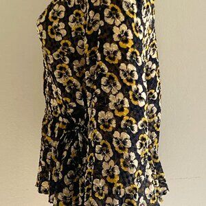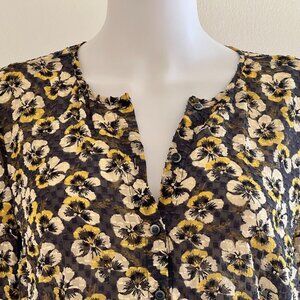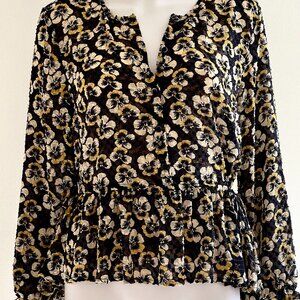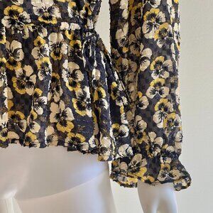 Madewell Sheer Flocked Navy Blue & Yellow Pansy Flower Ruffled Blouse Top, L