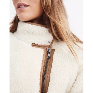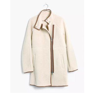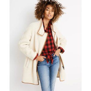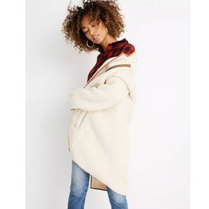 A cozy update to a cocoon coat with asymmetrical zips and a drapey foldover collar. Made of snuggly sherpa, you might want to keep this one on when you get indoors.