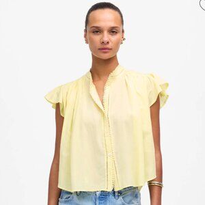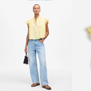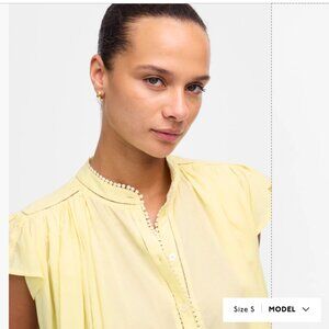 Adorable shirt with fantastic reviews. True XS if that's what you usually wear in Madewell-could also fit a small. Beautiful pale yellow/butter yellow.