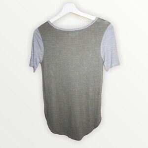 This short sleeve T-shirt from Madewell is great for lounging around the house or a more casual look. It is a medium shade of grey in the front and then switches to an olive green back color block. In very good condition with no visible flaws. Made with Madewell’s Anthem fabric (super soft!) with a loose fit and scoop neckline.