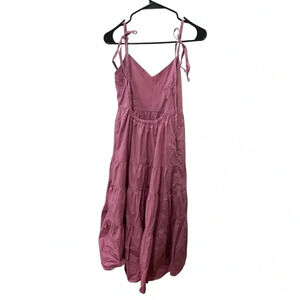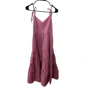 Lightweight poplin fabric. V neck. Adjustable tie straps. Tiered silhouette. Side pockets. 100% cotton. Color is a pink purple. Open back. .