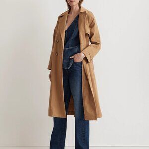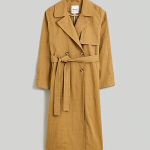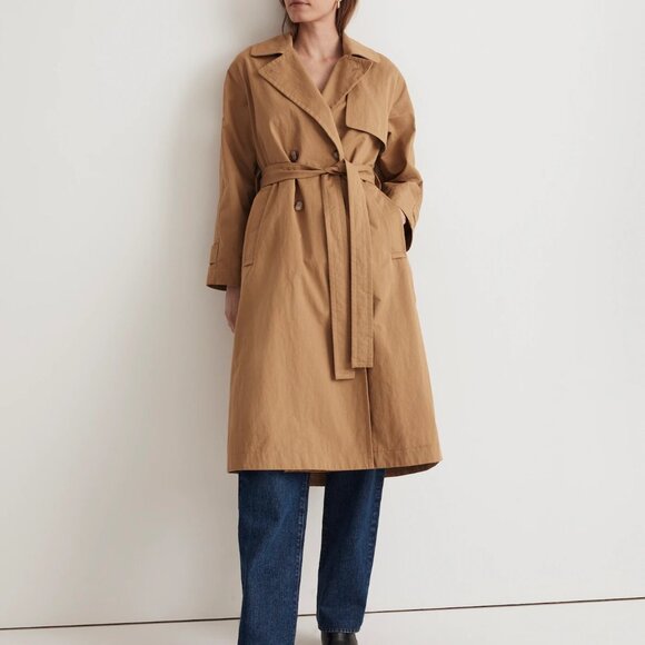 Crafted of a cotton-nylon blend with a water-resistant finish, this double-breasted trench coat is a total wardrobe essential. It has a mix of traditional details like a tie waist and storm flap, combined with a modern twist thanks to its fuller hem and raglan sleeves at the back.