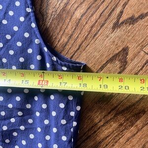Chic and timeless Madewell Silk Dotty Dress in a navy blue with white polka dot pattern. Made of 100% silk with a soft polyester lining for comfort. This sleeveless dress features a flattering V-neckline, functional front buttons, a gently gathered waist, and a flowy silhouette. Perfect for summer, layering, or even dressed up for work or events.