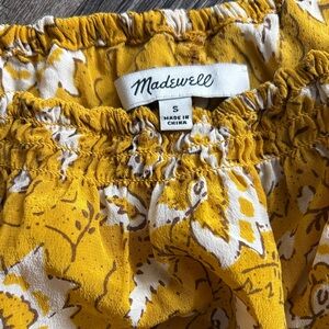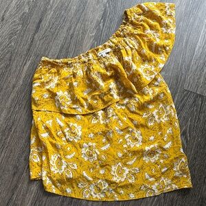 Elevate your style with this chic floral one-shoulder top. Beautiful mustard yellow and white floral print genuine silk top adds a vibrant touch to your wardrobe. Elastic and ruffle details across the top.