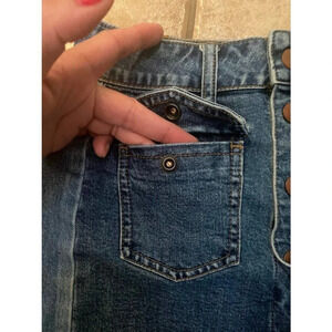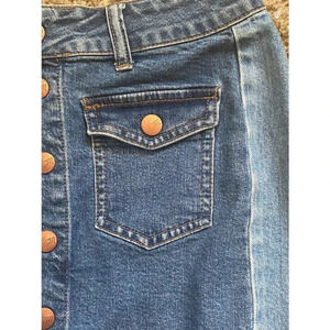 Preowned gently used Madewell Size 25 Denim with two-tone design Button-up Jean Skirt Mini Casual Pockets Summer Ready. This is in good condition with no rips or tears. See pictures for condition. Ready to wear!