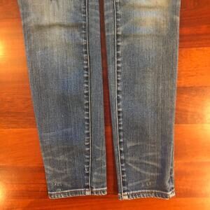 Intentional manufacturer distressing on front of legs with an inside patch on one of the two rear pockets