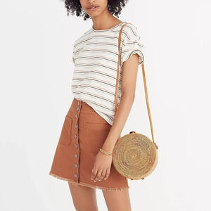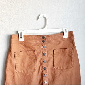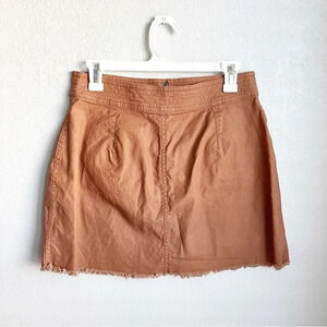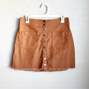 DETAILS: Madewell size 6. High waist snap skirt. Mini length. Brown orange color scheme, intentionally raw hem. Cotton spandex. J3992.