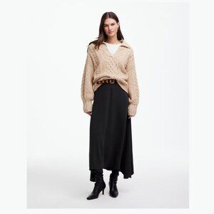 Madewell black asymmetric midi skirt with a high-low hemline. Made from a lightweight, drapey crepe that moves beautifully with every step. The asymmetrical cut gives the skirt a modern edge while keeping it versatile and wearable for many occasions.