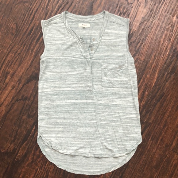 Madewell Heathered Green Sleeveless Tee. Size Xs. 1/4 button up and pocket. Curved hem is longer in back.