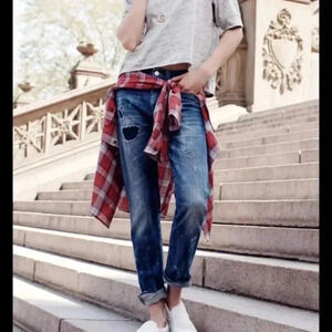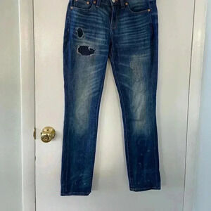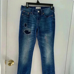 Madewell Slim Boyjean Rip and Repair Sz 25 approximate measurements west 15in. Front rise 9in inseam 29in long 38in. Medium Wash Distress Jean Style A0376.