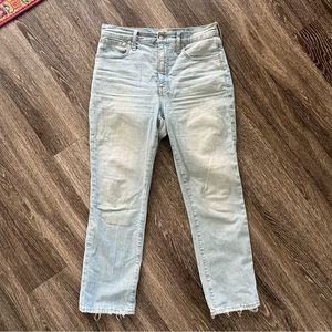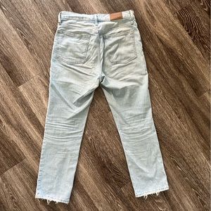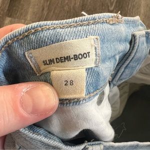 Light blue wash Slim Demi Boot jeans from Madewell. They’ve been loved and just don’t fit me anymore.