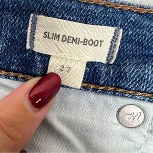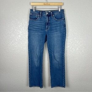 These Madewell Slim Demi-Boot Jeans in the Enright Wash feature a high-rise waist and a straight leg with a subtle kick-flare hem. Designed for a flattering silhouette, they blend vintage charm with modern comfort. Size 27 with a classic five-pocket layout and zip-fly closure.