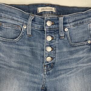 These Madewell jeans are a size 24 with a slim fit and a mid-rise waist. They feature a solid light wash denim fabric with a button closure and a straight leg silhouette. The jeans have a slimming effect and are machine washable. They also include accent details like buttons, zippers, and the brand logo. Perfect for all seasons, these versatile jeans are a timeless addition to any wardrobe.