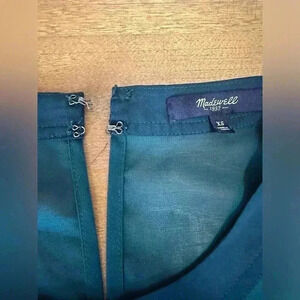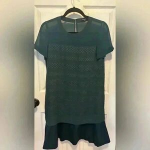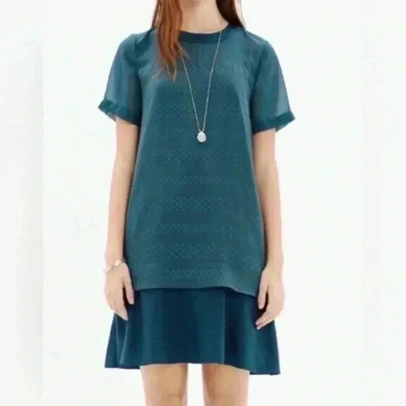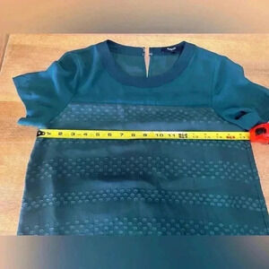 Emerald green short sleeve shift dress. One of the hooks is detached on the neckline as shown