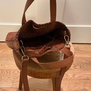 good condition. Has detachable long strap. Inner zipper pocket. 3 1/2 in top handle drop. Bag cavity about 9 1/2 in x 10 1/2 in x 3 in.