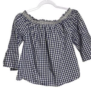Madewell Smocked Gingham Off the Shoulder Navy and White Top XS (2369)